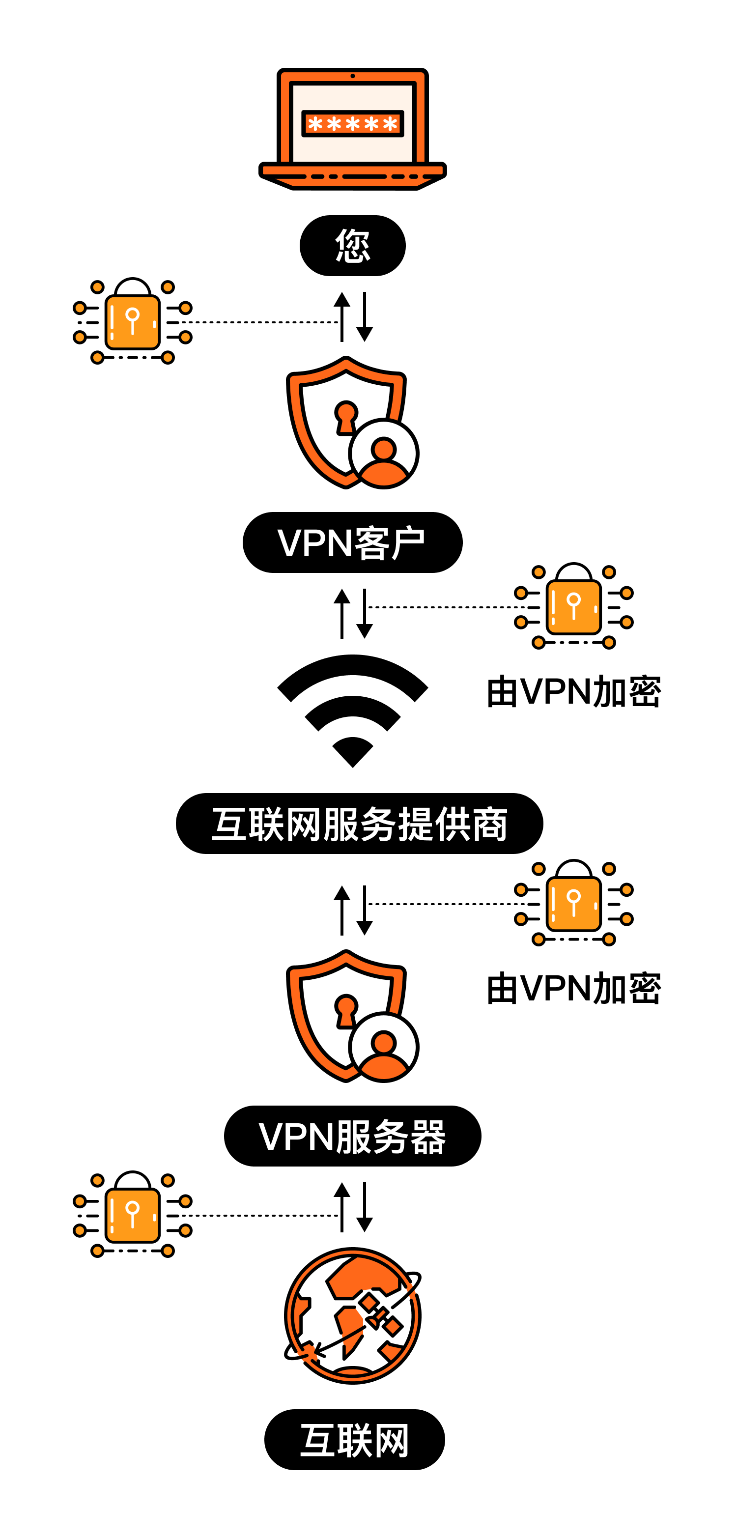 VPN 能“隐藏”的信息,本质上是把你的流量先加密送到 VPN 服务器,再由服务器代你访问网络,所以它主要遮蔽的是网络出口与传输内容这一层的信息。